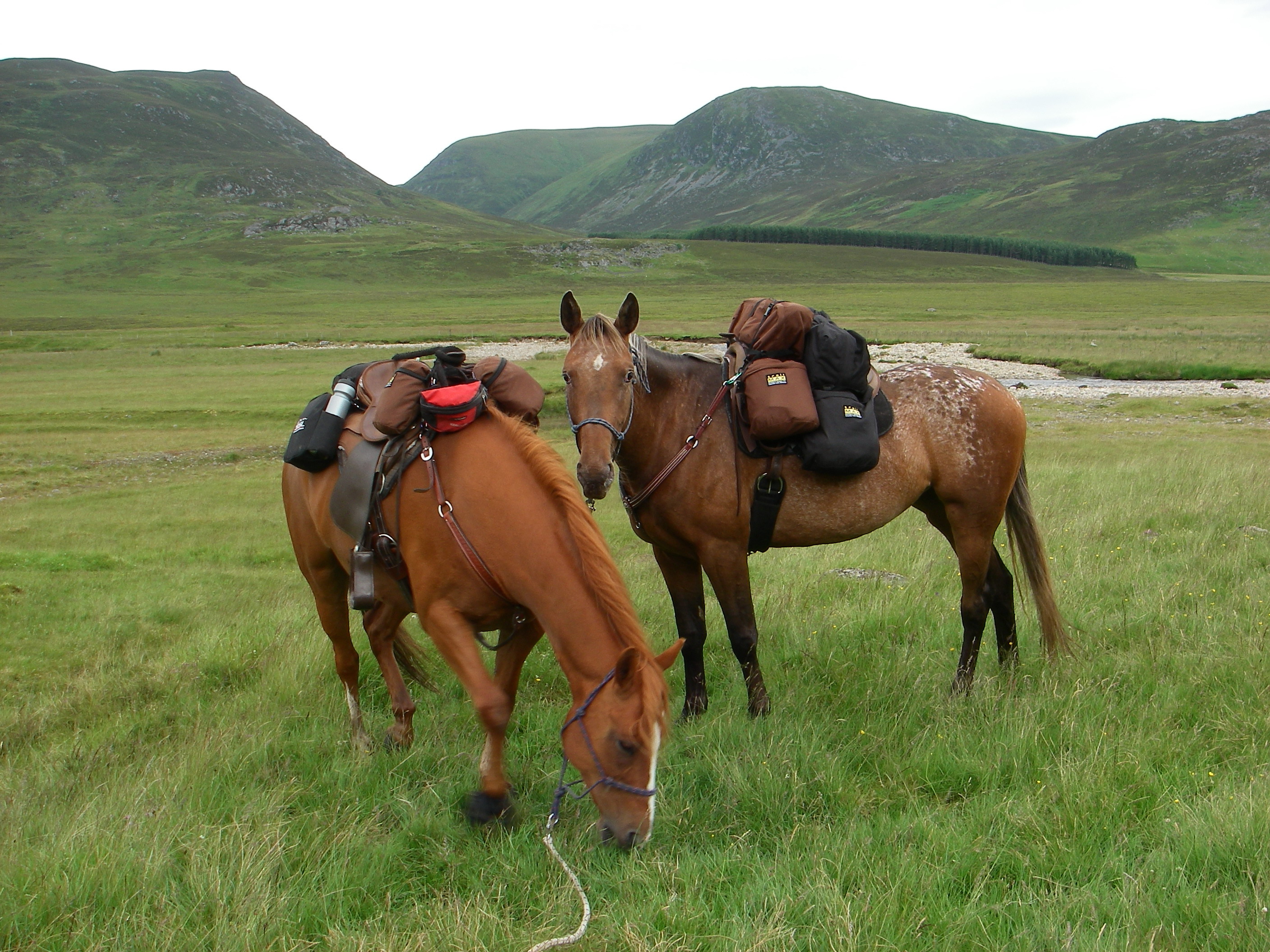IMGP6048 Camping with horses… I have devised my own corral system as I just haven’t found one out there that suits my needs.  It consists of electric tape, telescopic bank sticks for poles (fishing shop), guy lines, pegs, baler twine and gaffa tape (there always has to be gaffa).  It doesn’t take too long to put up or take down (about the same time as your own tent).   It would be nice to be able to say that I have such an awesome system that I can stay tucked up nice and warm in my sleeping bag all night, but sometimes that minx Swift escapes the Corral!  Generally all it takes is finding a couple of trees or a fence line to make my system more bomb proof, but when it is stand alone… it can be a bit hit or miss.  Yogi the “scared-of-everything-horse” stays inside though, so Swift doesn’t stray far from her best buddy.  She will however try to get inside your bothy or tent once out of the corral (out of curiosity)…